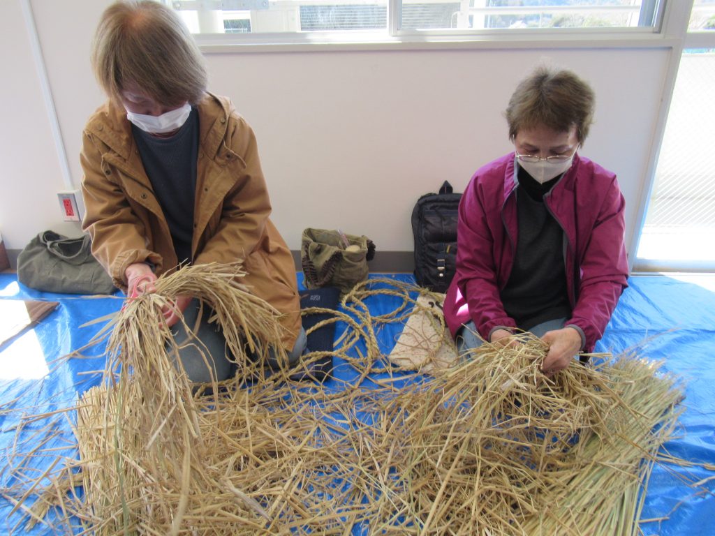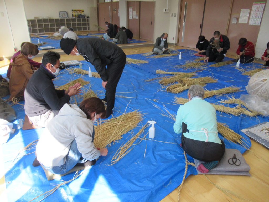 当日は10名の方が参加され熱心に取り組みました。用意した藁は当いきいき清和が昨年の秋に収穫した「まんげつもち」の藁です。昭和39年東京オリンピックを境にして今迄の昭和初期の生活に別れを告げ化石燃料を中心とした生活が発展し今迄の藁が中心の生活から塩ビ製品の生活に大きく転換しました。